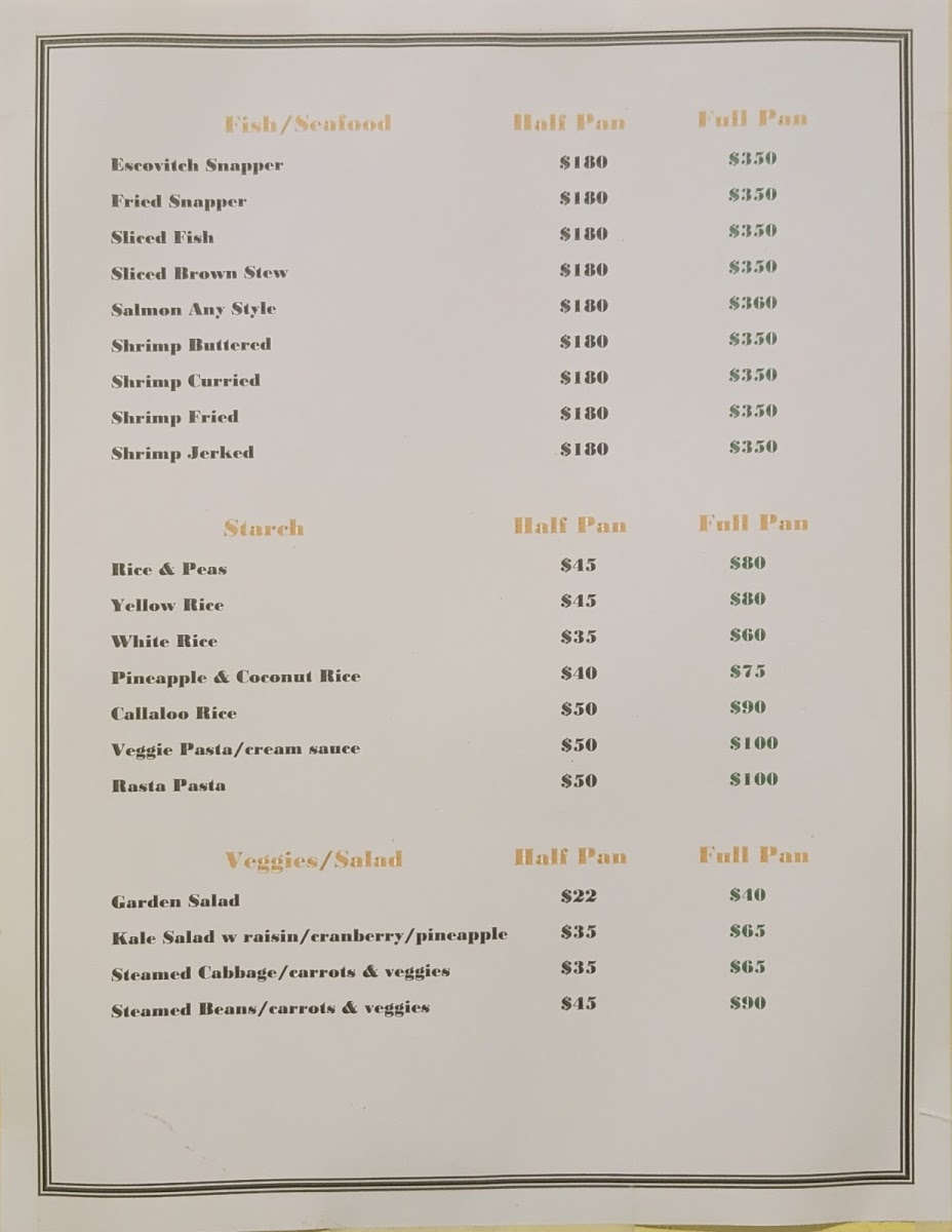 The menu features a selection of traditional Jamaican dishes, organized into several categories to help visitors easily navigate their options.